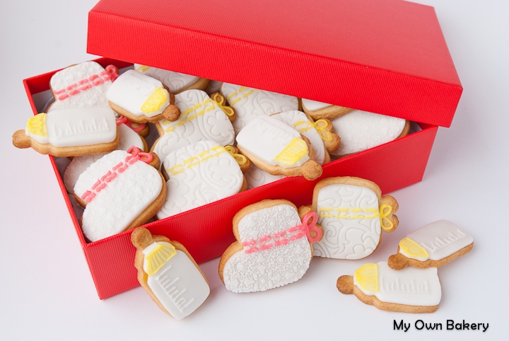 Ahora que ya tienes las galletas hechas y completamente frías es momento de dejar volar tu imaginación! En mi caso estiré el fondant blanco y fui cortándolo con los cortapastas que había utilizado para las galletas. Para decorar los patucos utilicé unas plantillas que se ponen sobre el fondant para darles ese dibujo tan gracioso. Para pegar el fondant a las galletas tan solo tenéis que usar la mezcla de mermelada y agua. Poner unas gotitas sobre cada galleta y encima el fondant.